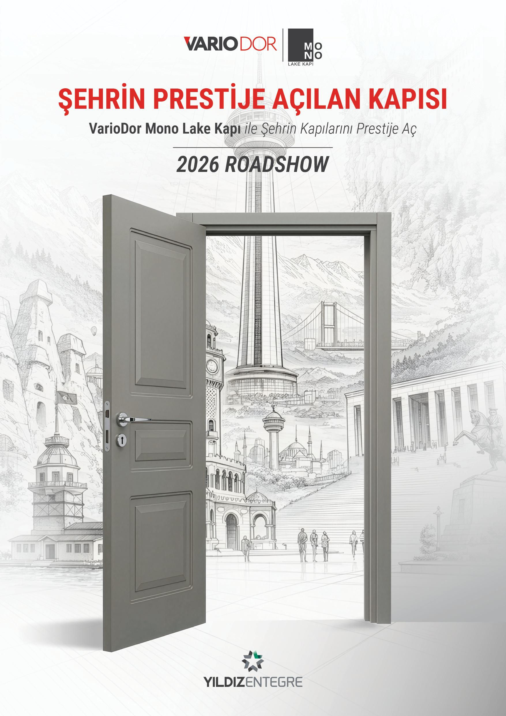 Yıldız Entegre, Variodor Mono Lake Kapı Koleksiyonu’nu “Şehrin Prestije Açılan Kapısı” konseptiyle 12 şehirde sektör profesyonelleriyle buluşturuyor. 20 Nisan – 16 Haziran 2026 tarihleri arasında gerçekleşecek Roadshow kapsamında koleksiyonun tüm model ve renk seçenekleri doğrudan deneyimlenebilecek.