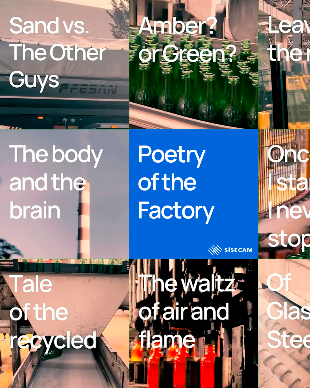 “Poetry of the Factory” projesi, Şişecam’ın cam ambalaj ve düz cam fabrikalarında üretimin farklı aşamalarını anlatan on kısa filmden oluşuyor. Bu filmler teknik süreçleri açıklamak yerine, üretimi yaratıcı ve ilgi çekici içeriklere dönüştürüyor. Her aşama, farklı bir müzikal tür ve anlatı diliyle ele alınarak cam üretimine şiirsel bir perspektif kazandırıyor.